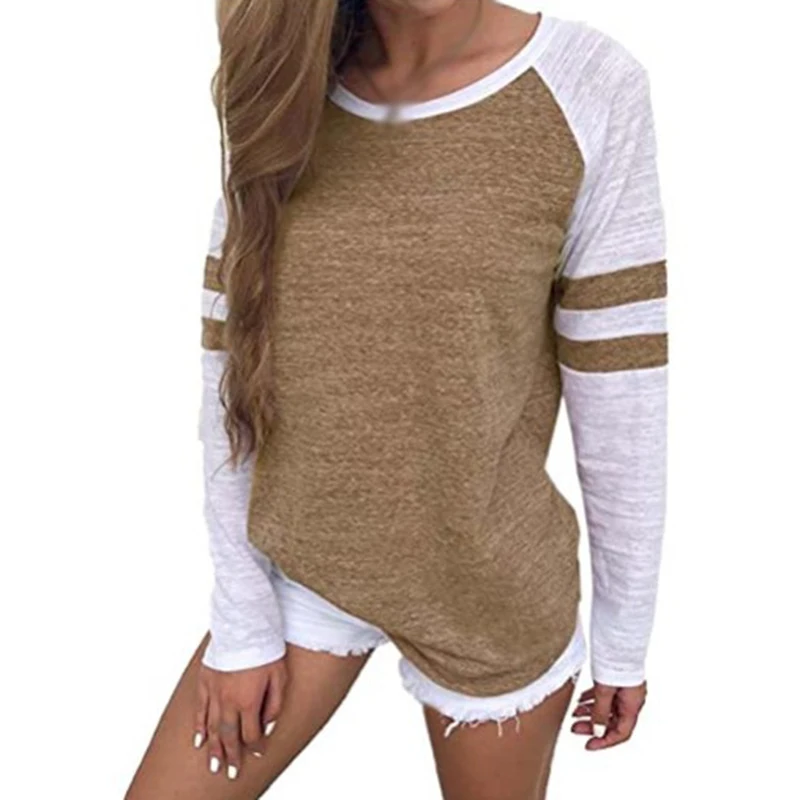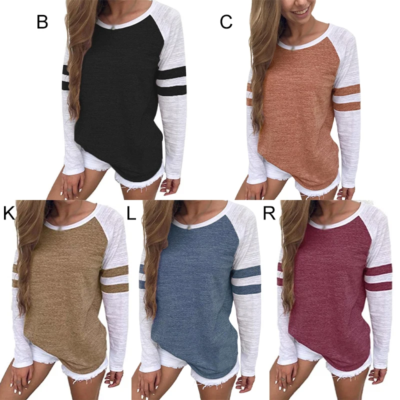 Купить Autumn Women T-shirt Long Sleeve Crew Neck Striped Splice Top Tee Color Block Basic Tunic Top Causal Blouses Pullover Sweatshirt за 450рублей