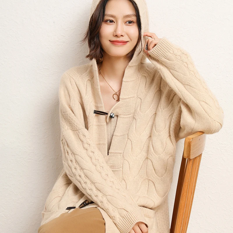 Купить Autumn and Winter New Big Twist Pattern 100% Pure Wool Women's Medium Long Knitting Cardigan Hooded Thickened Cardigan Coat за 4250рублей