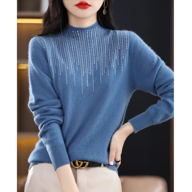 Купить Autumn and Winter New Pure Cashmere Sweater Women's Half High Collar Diamond Inlaid Korean Version Loose and Versatile Pullover за 1200рублей