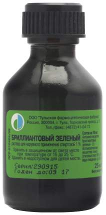 БРИЛЛИАНТОВЫЙ ЗЕЛЕНЫЙ представляет собой прозрачный интенсивно зеленого цвета раствор, с запахом спирта . По 30 мл или 50 мл во флаконах из стекла, укупоренных пробками и крышками . . .
