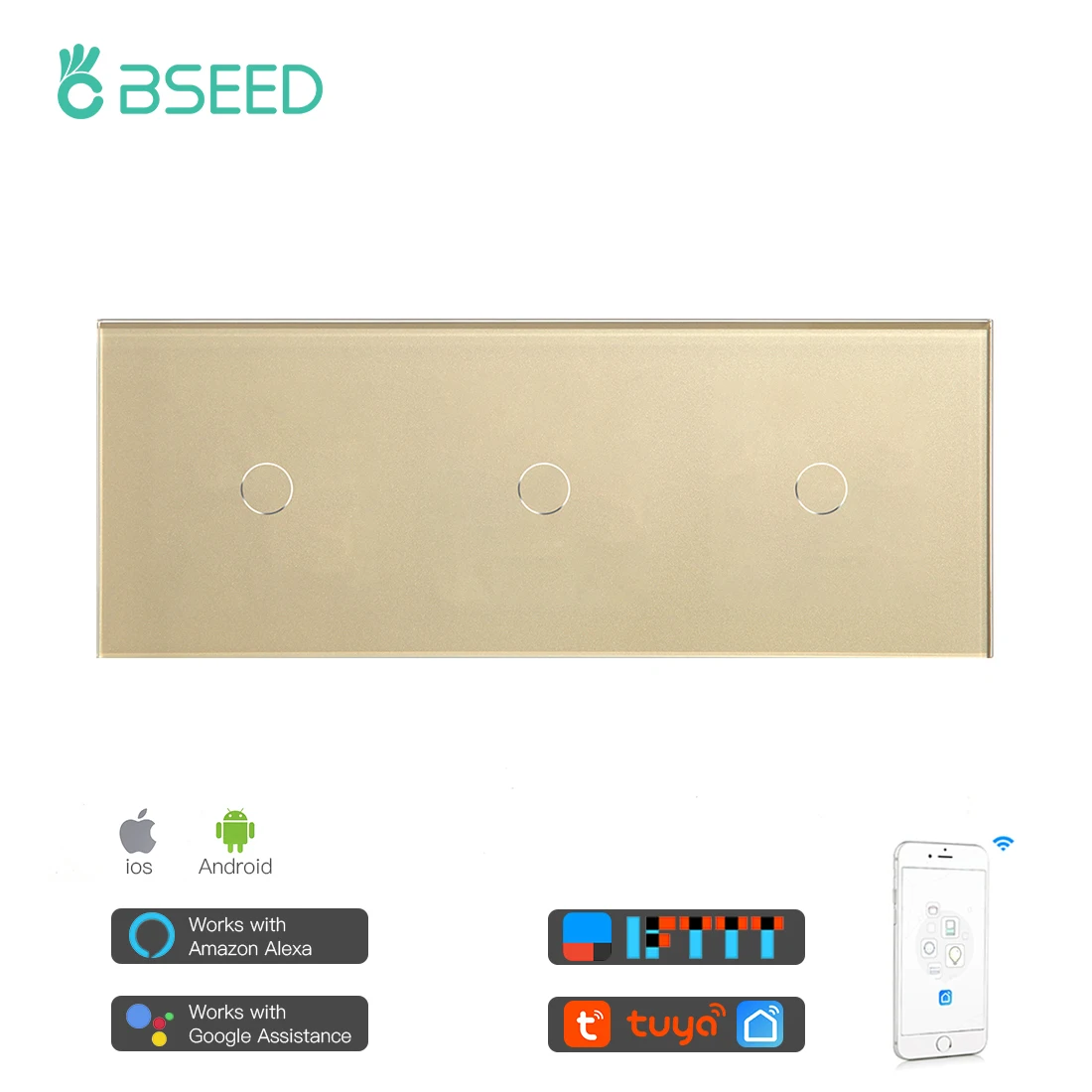 Купить Bseed Mvava Smart 3 Gang WifI Control Touch Switch Work With Tuya 228mm Light Switch White Black Gold Mirror Crystal Panel за 2100рублей