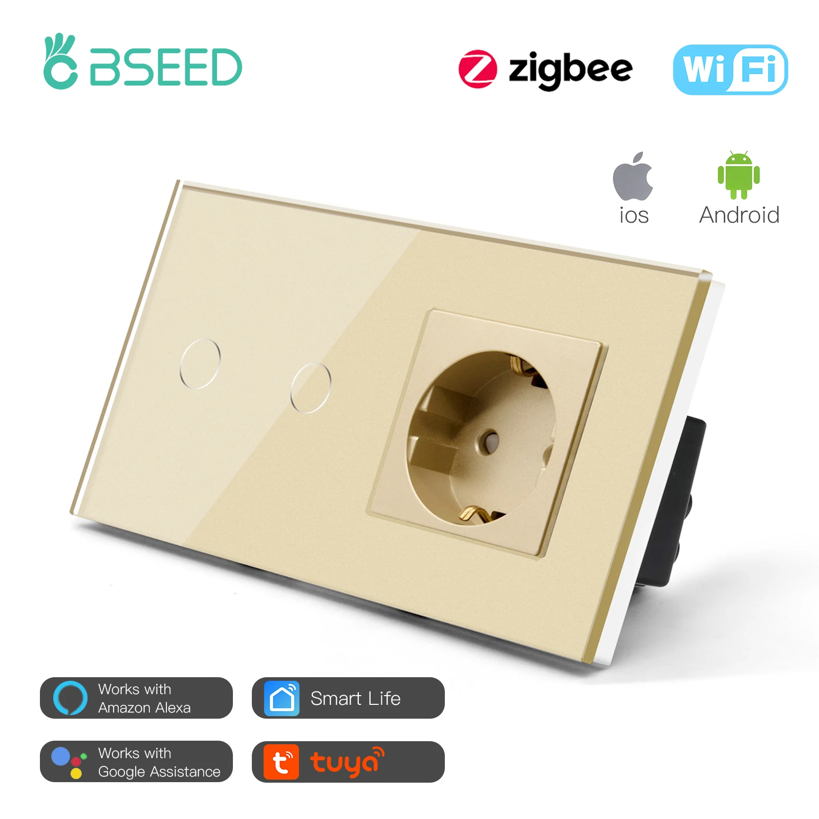 Купить Bseed New Zigbee Single Live 1/2/3 Gang Touch Switch EU Standard With Normal Socket 4 Color Crystal Glass Panel Smart Home за 1150рублей