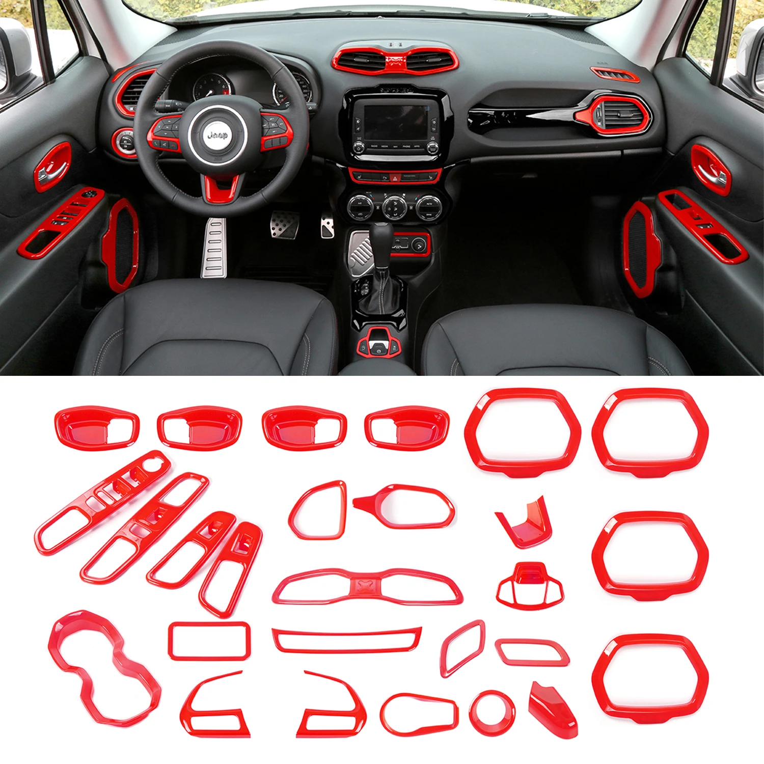 Купить Car Interior Decoration Cover Sticker Accessories for Jeep Renegade 2016 2017 2018 Steering Wheel&Center Console Air Outlet Trim за 3800рублей