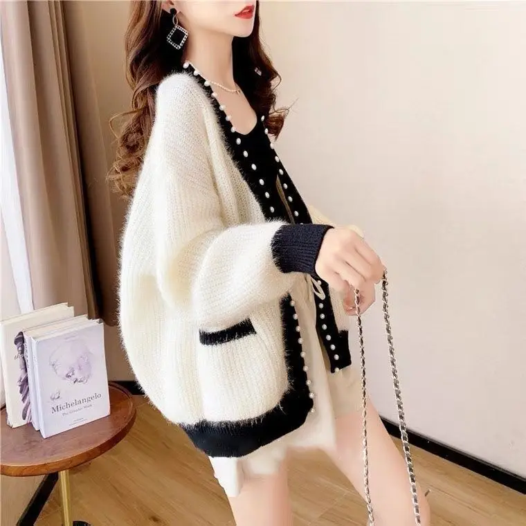 Купить Cardigan 2022 New Spring and Autumn Beaded High-End Sweater Women's Loose and Lazy Style Knitted Coat за 800рублей