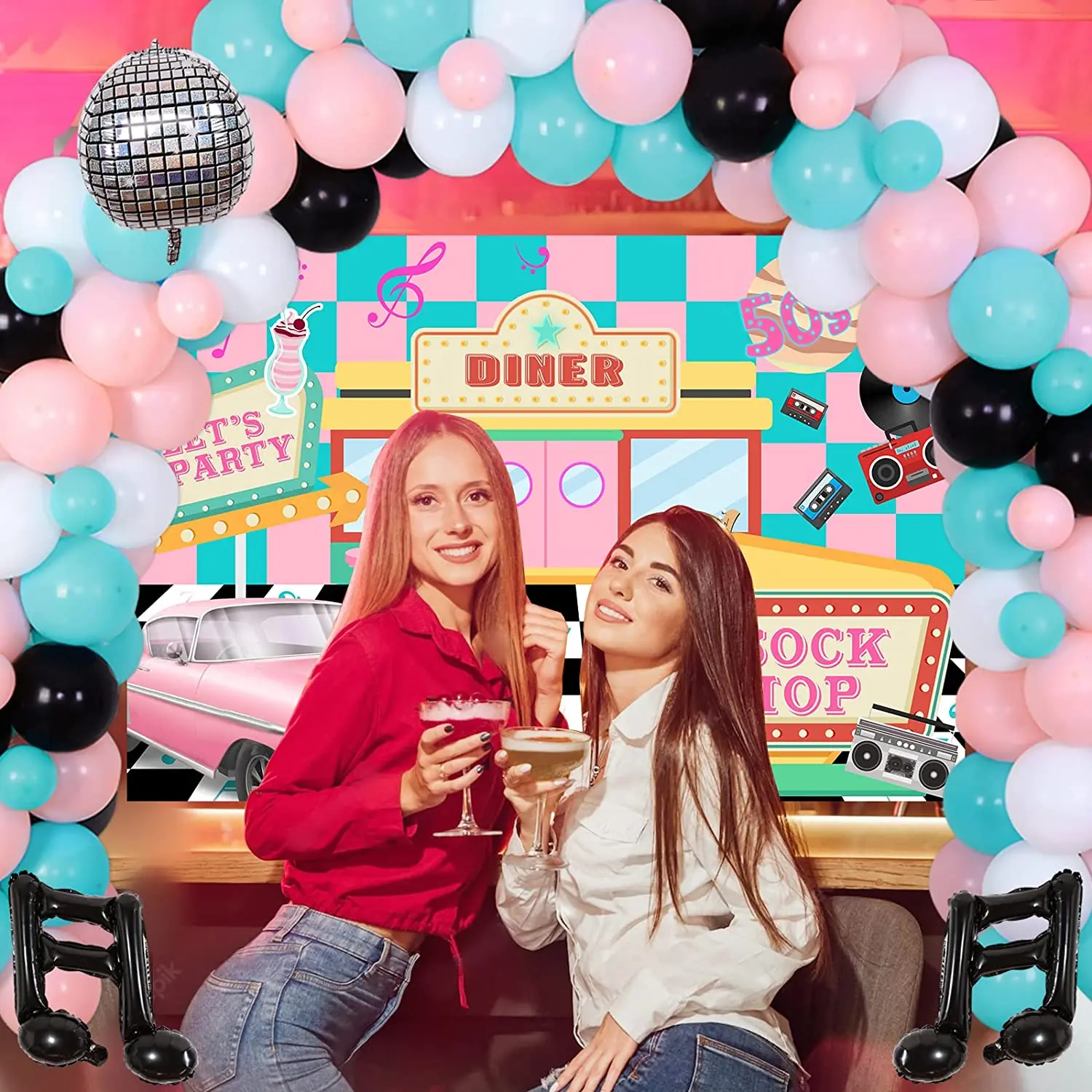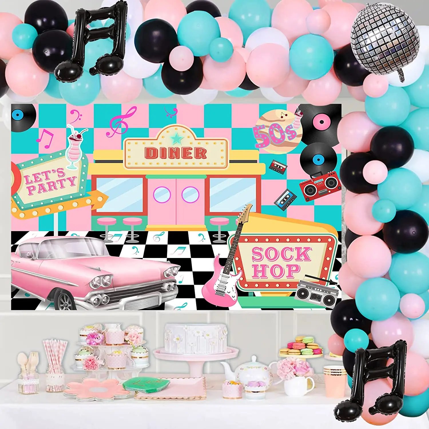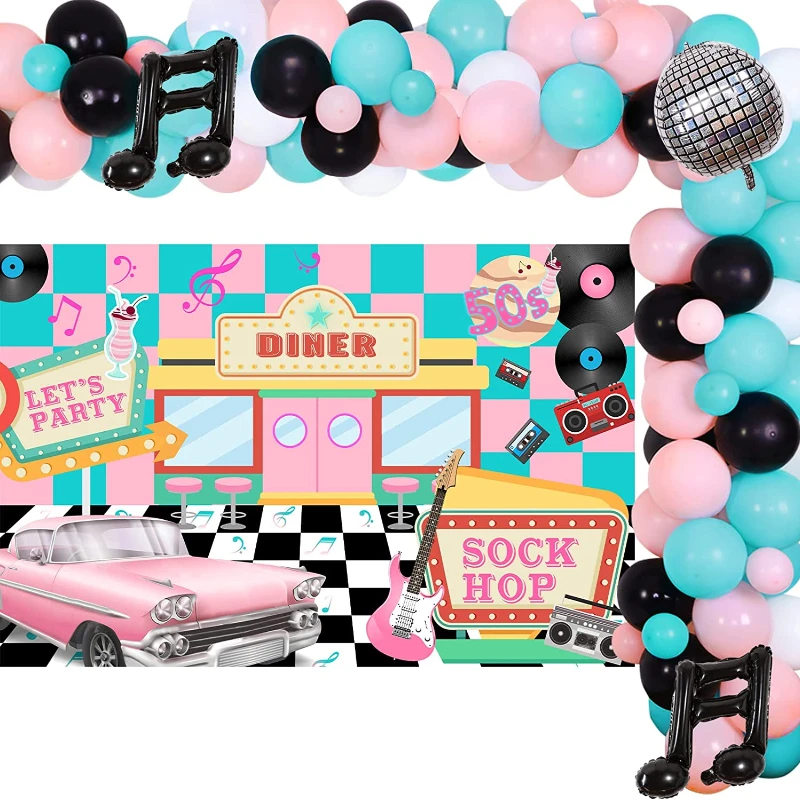 Купить Cheereveal 50's Retro Disco Hip Hop Party Decorations Pink Blue Balloon Garland Kit Music Note Foil Balloons Sock Hop Backdrop за 950рублей