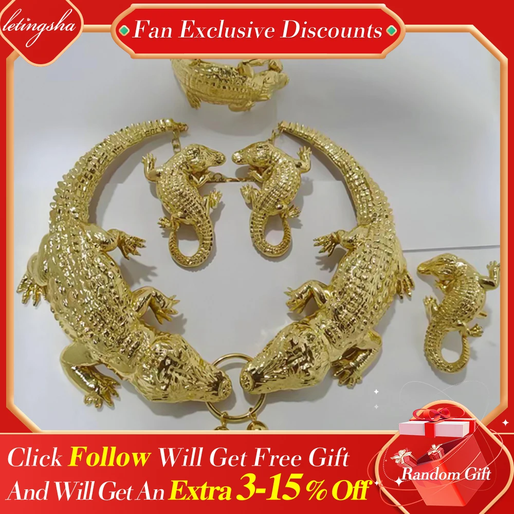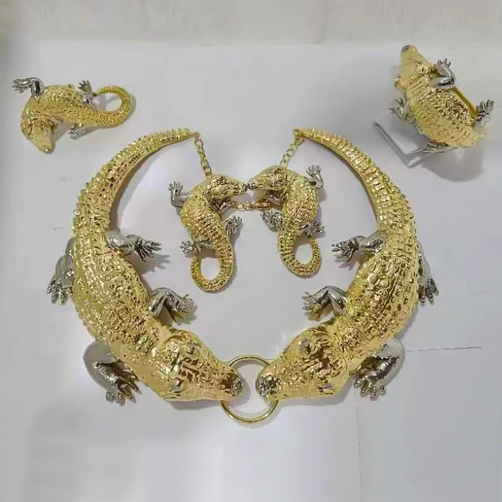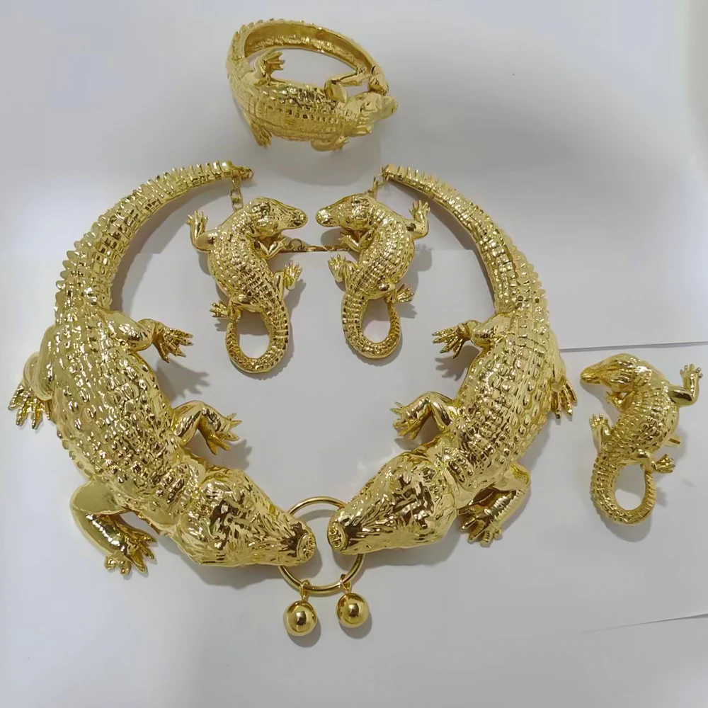 Купить Crocodile Jewelry African Earrings Set Fashion Women Gold Plated Ring Bracelet Wedding Necklace Pendant Dubai Pendant Party Gift за 950рублей