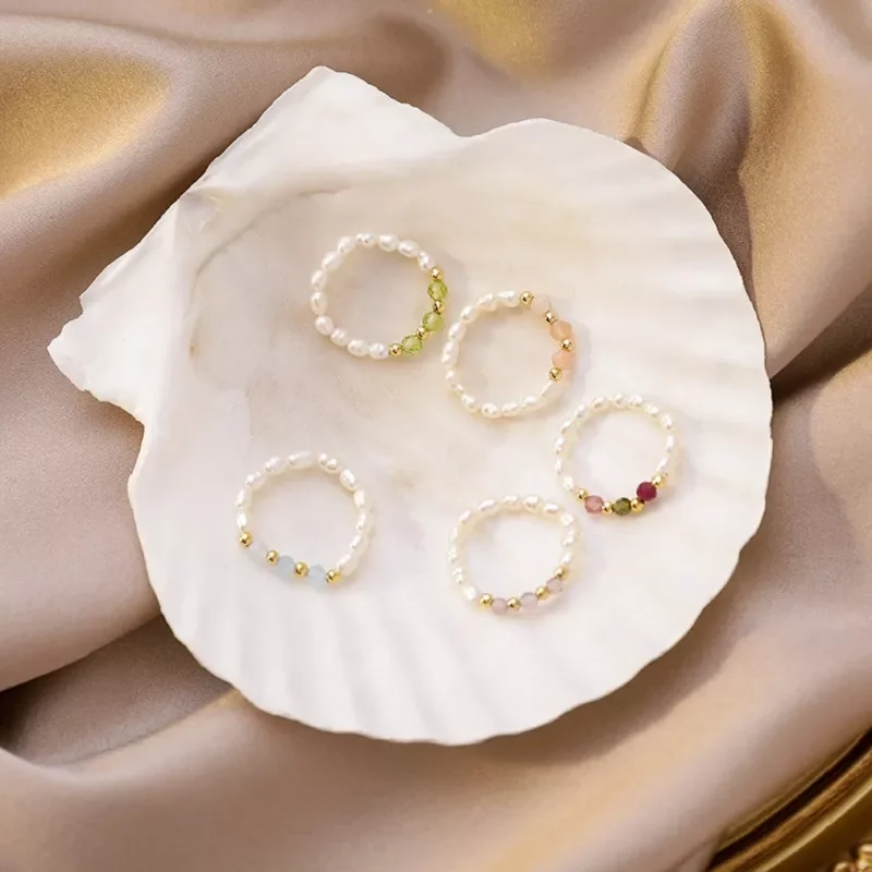Купить Cute Multi Beaded Imitation Pearl Colorful Crystal Adjustable Rope Chain Rings For Women Continuous Circle Minimalist Ring за 450рублей