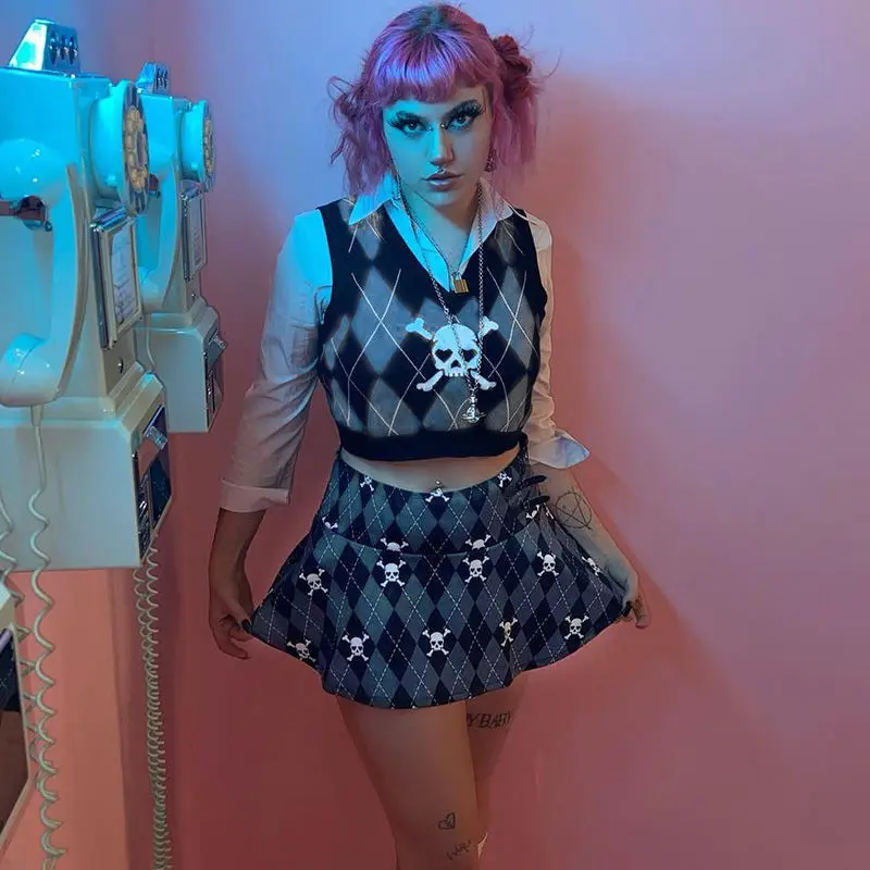 Купить Dark Spring and Autumn Sweater Vest Female Designer Skull Head Diamond Knitted Vest Fashion Casual Streetwear Retro Sweater New за 900рублей