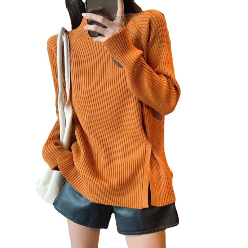 Купить Design Sense High Neck Split Sweater Women's Roll Collar Mock Slit Hems Striped Pit Relax Sweater Solid Color Pulls Casual Tops за 1350рублей