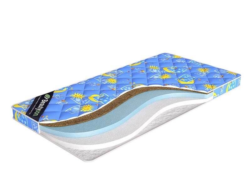 Детский беспружинный матрас из экопены и кокосовой койры. Чехол съемный на молнии. Состав чехла: детский поликоттон.