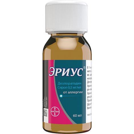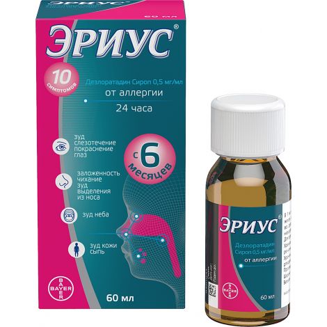 Купить − + Эриус, сироп 2 .5 мг/5 мл, 60 мл . . . После приема препарата внутрь дезлоратадин хорошо абсорбируется из желудочно-кишечного тракта, при этом определяемые концентрации дезлоратадина в . . .