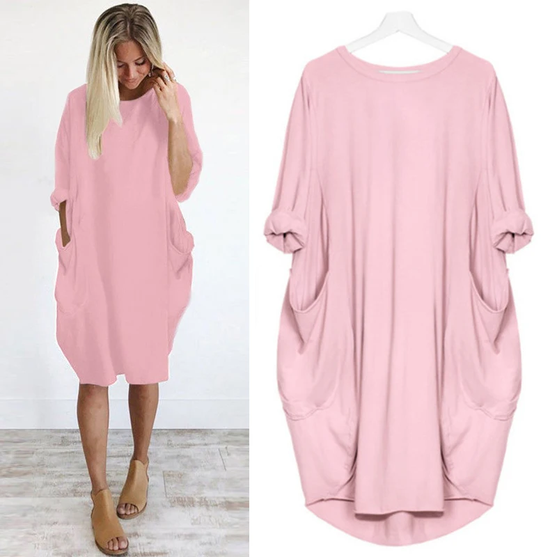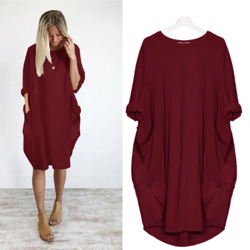 Купить Dresses For New Year 2022 Women Clothing midi Casual Loose Shirt Dress Long Sleeve Solid Vintage O-neck Elegant Dress за 550рублей
