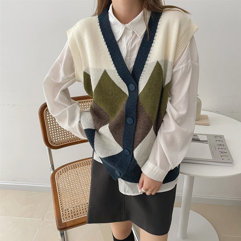 Купить EHQAXIN 2022 Autumn Womens Knitted Vest Korean Loose V-Neck Contrast Color Stitching Plaid Vest Single-Breasted Sweater One Size за 1200рублей