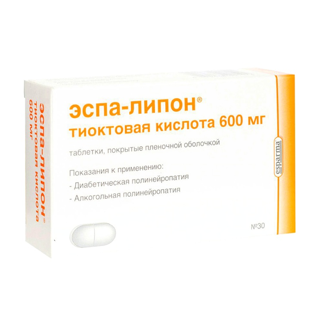 Эспа-липон инъекц 600 раствор д/ин . 25 мг/мл (600 мг) по 24 мл №5 в амп . ESPARMA, GmbH Эспа-липон 600 таблетки, п/о по 600 мг №30 (10х3)
