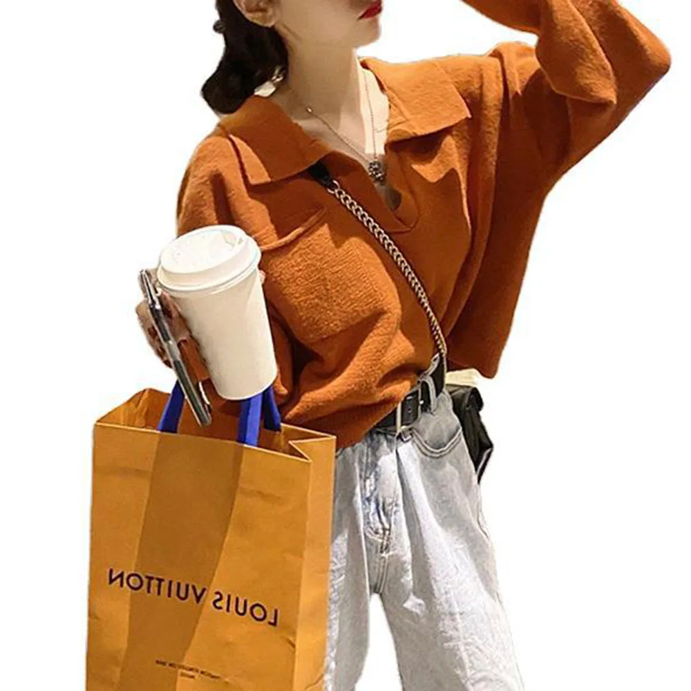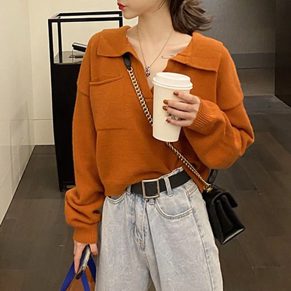 Купить Fashion V-neck Knitted Pullover Autumn Winter Clothes Korean Loose Thick Short Sweater Women Pockets Orange Chic Sweaters New за 700рублей