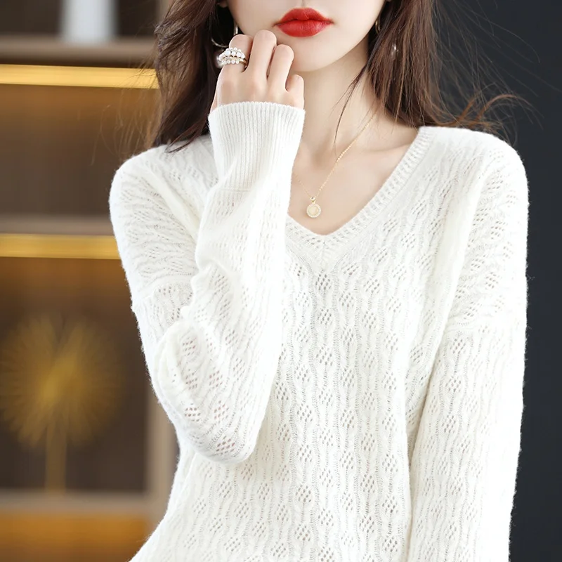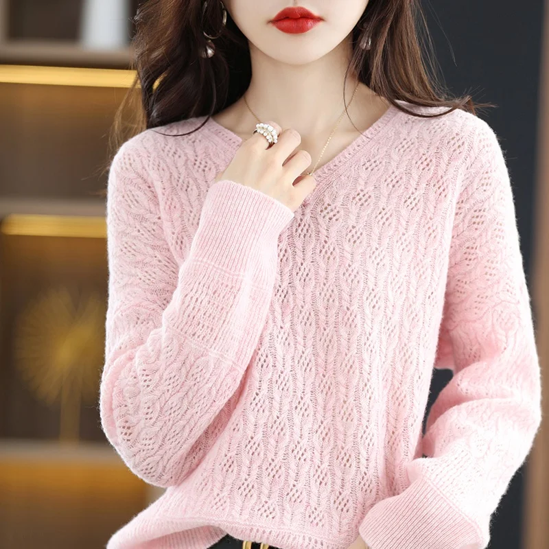 Купить Four Seasons Moze 100% Pure Wool-Knit Ladies' V-Neck Pullover Solid Color Cut-Out Spring And Autumn New Korean Fashion Loose Top за 1800рублей