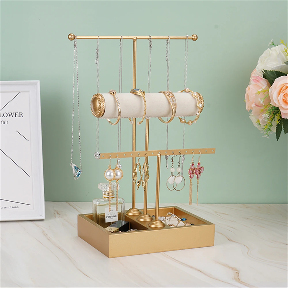 Купить Golden Metal T-shaped Bracelet Ring Earring Organizer Jewelry Holder Stand Necklace Display Rack with Storage Box Base за 1550рублей
