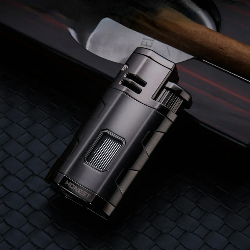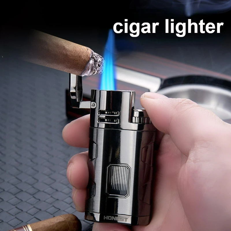 Купить Honest Personality Multi-function Three-straight Blue Fire Inflatable Lighter Metal With Cigar Drill Viewing Window Gas Lighters за 450рублей