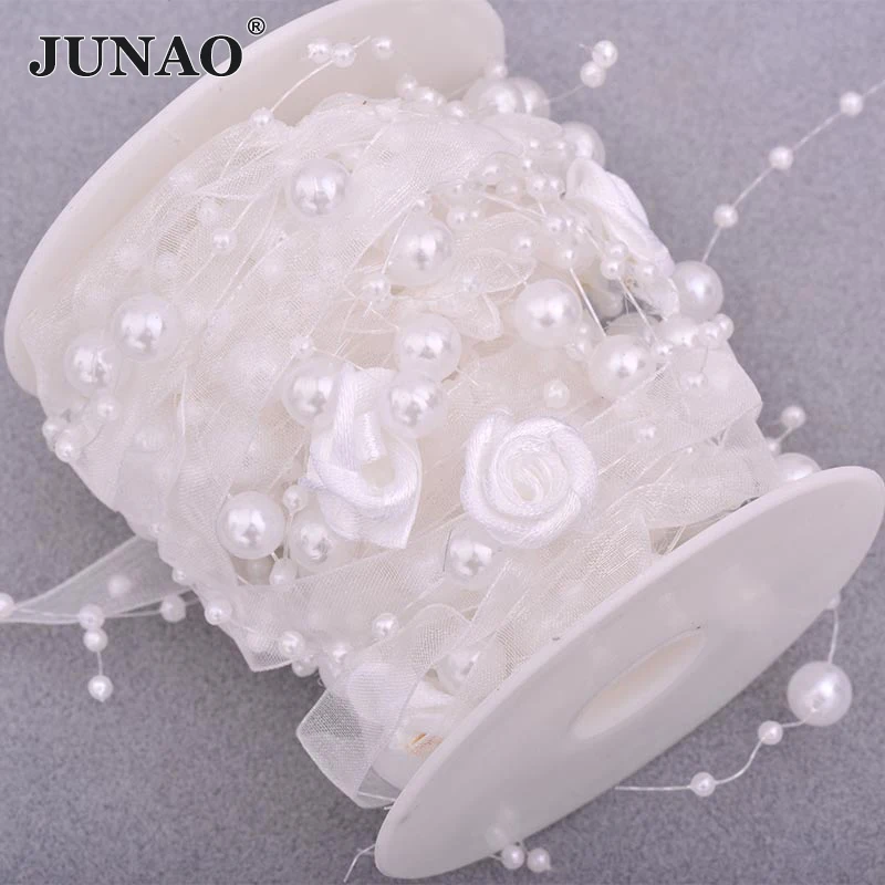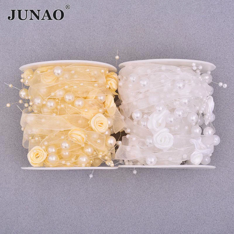Купить JUNAO 5 Meter Beige Color Pearl Rhinestone Trim Chain Rose Ribbon Tape Applique Strass Banding For Clothes Shoes Decoration за 350рублей