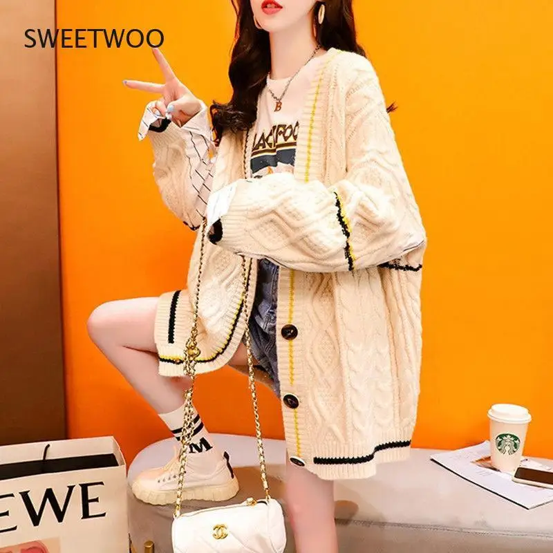 Купить Jacquard Knitted V-Neck Cardigan Women Autumn Winter Buttons-Up Loose Printed Sweater Female Kimono Cardigans Knit Tops 2022 за 1300рублей