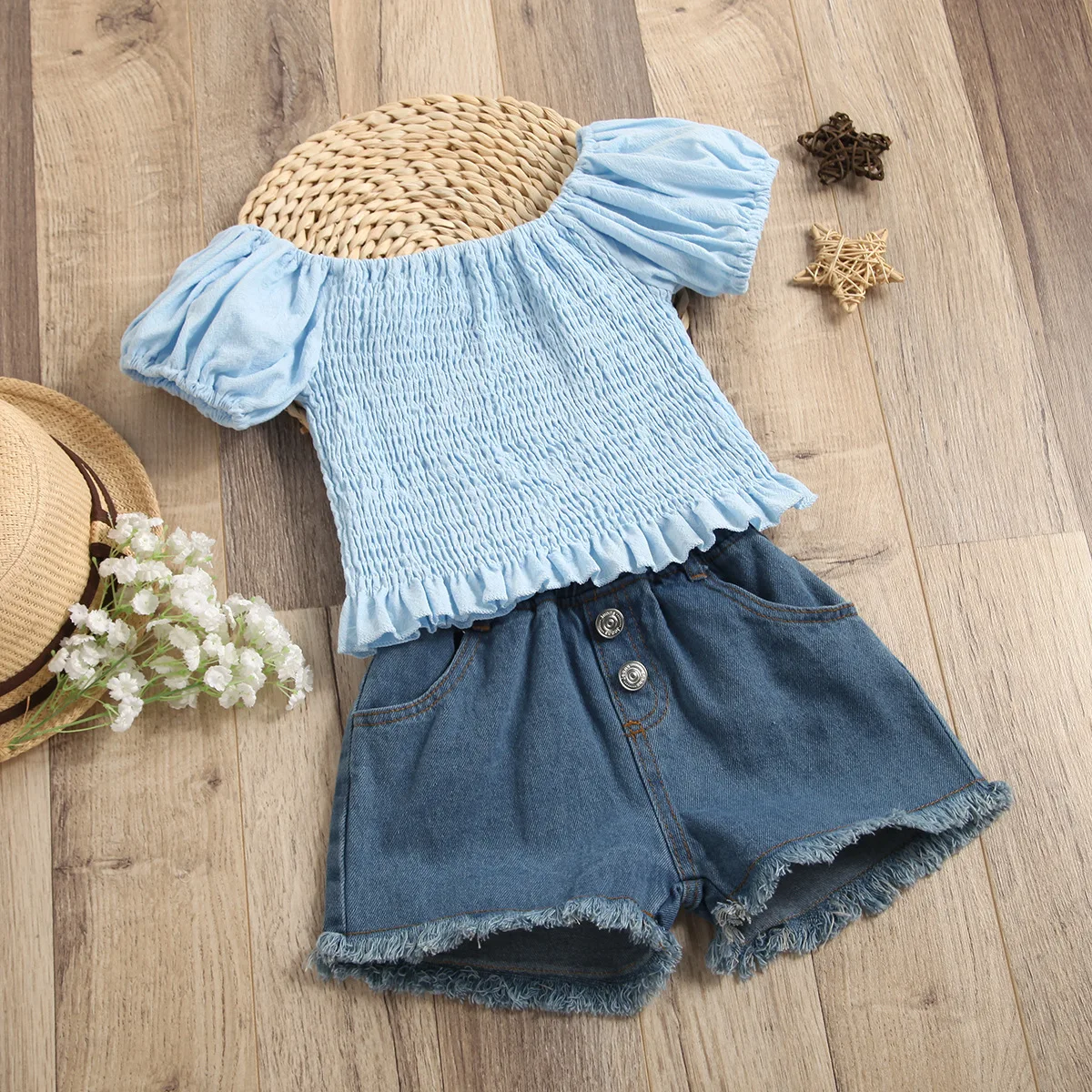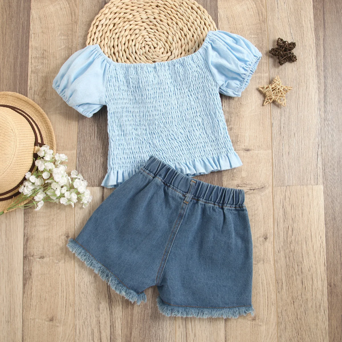 Купить Kids Clothes Girls Sets 2pcs Lantern Sleeve Ruffle Shirts Tops + Pocket Denim Shorts Toddler Clothing Set Summer Infant Outfits за 650рублей