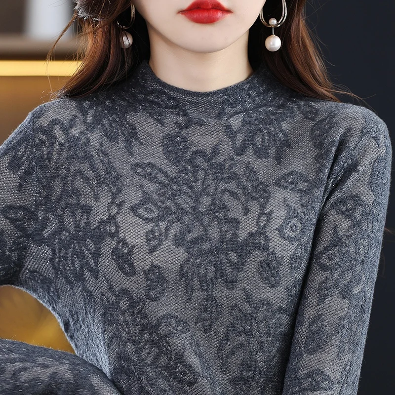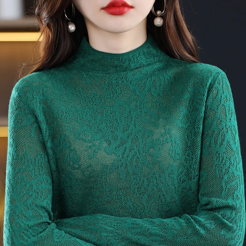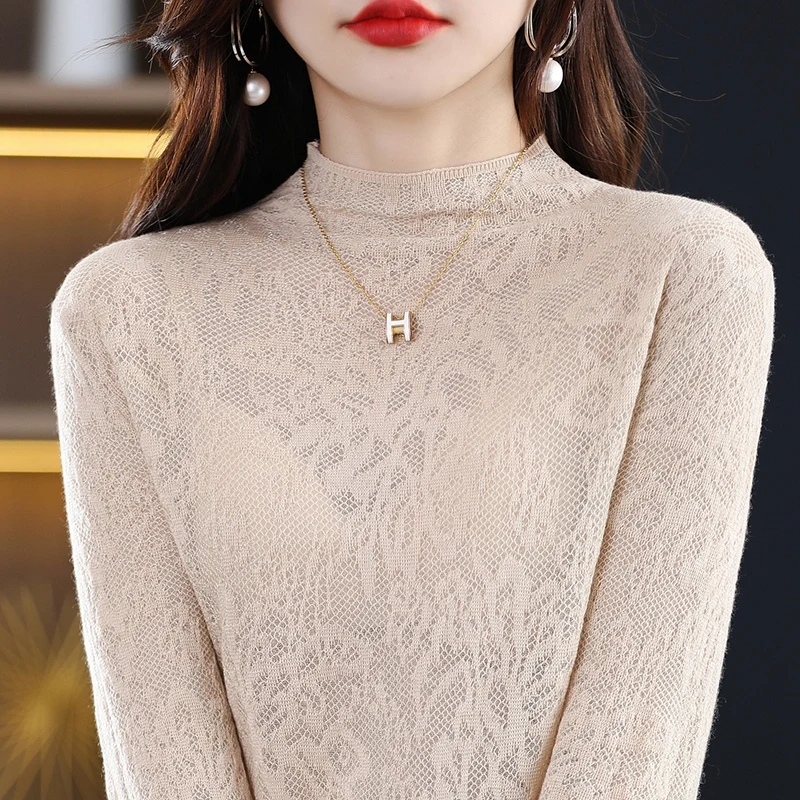 Купить Knitted Three-Dimensional Carved Lace Hollow 2022 Spring And Autumn New Half Turtleneck Imitation Wool Pullover Bottoming Shirt за 1100рублей