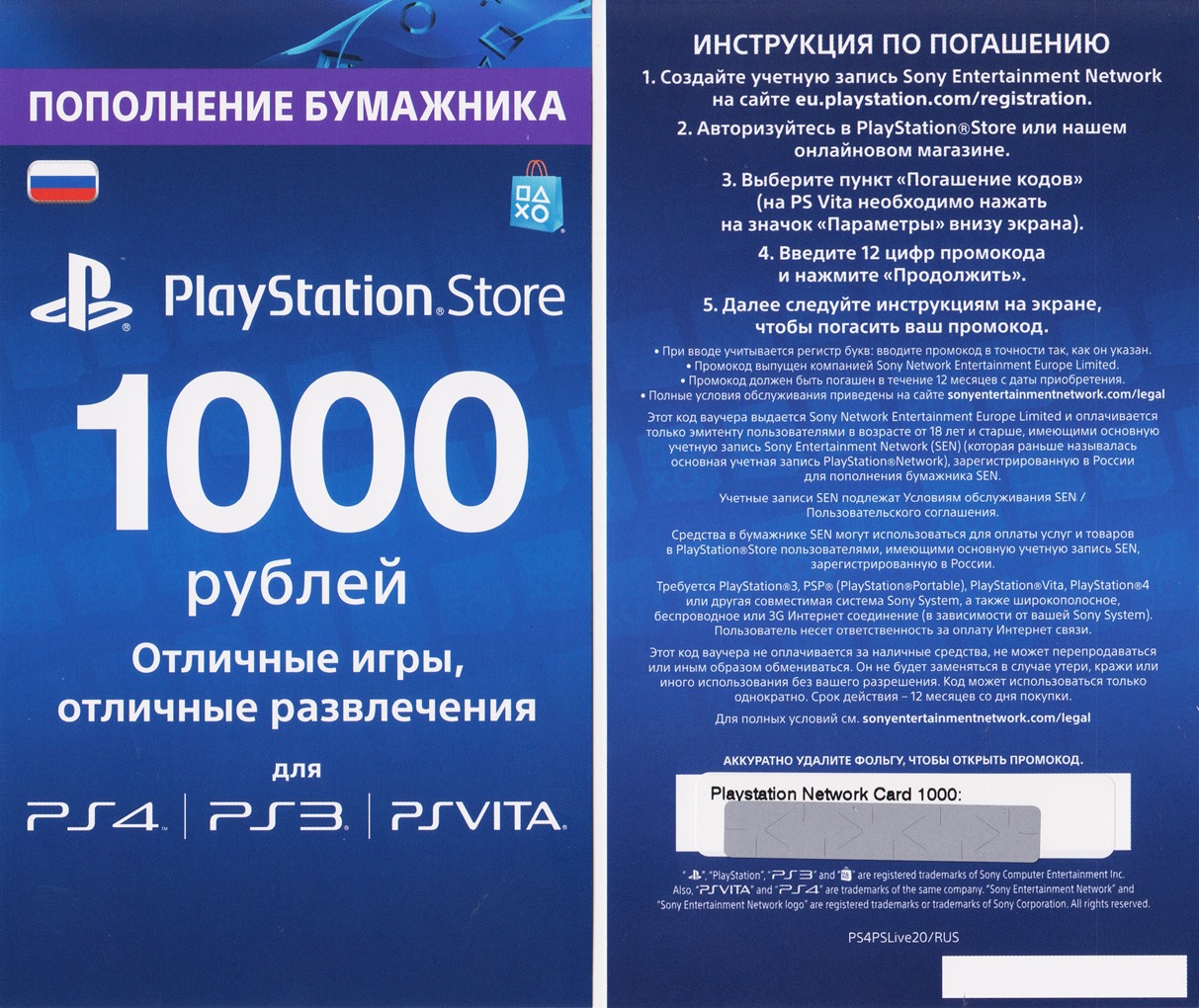 PSN 1000 руб . 38,99 р . PSN 1000 купить цифровой код PlayStation Network сервиса на 1000 российских рублей .Код псн 1000 подходит для систем PS5, PS4 , PS3 и PS Vita .Это код сони psn 1000 руб или цифровой код sony psn 1000 руб . remove .