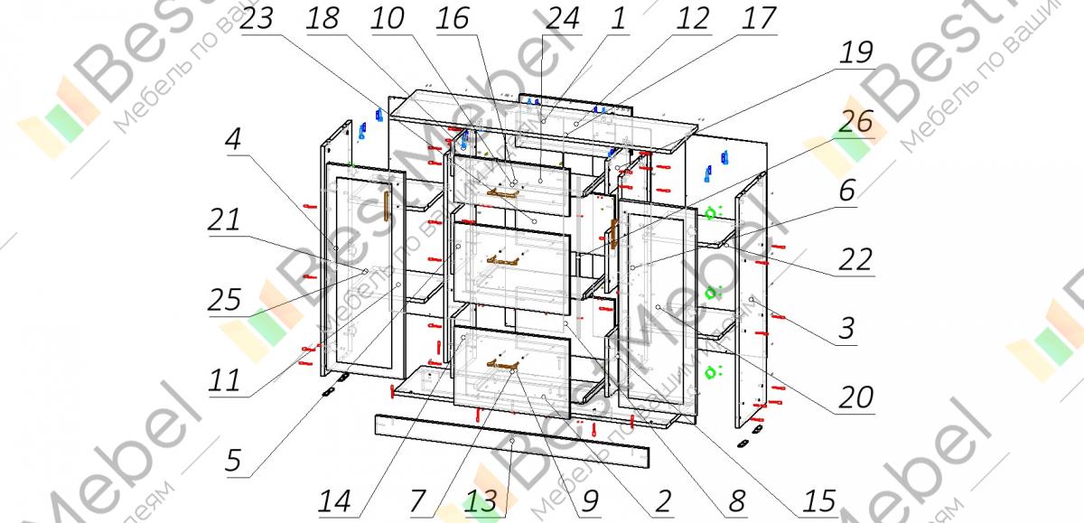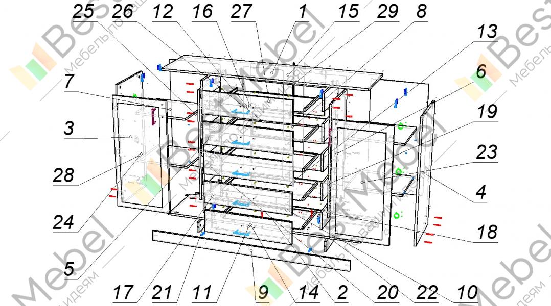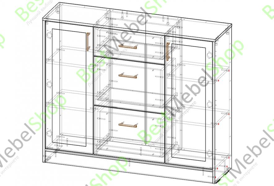 В базовой комплектации в комоде 6 ящиков, 3 полки и 2 дверки (комплектация может быть изменена по индивидуальному проекту). Данная модель подойдет для спальни, прихожей. Вместительное пространство внутри можно использовать для хранения игрушек или множества других целей, а верхняя поверхность станет дополнительной полкой для декоративных украшений . Ручки комода прекрасно будут смотретьсяв Вашем интерьере. Наши комоды - это стандарт настоящего качества.