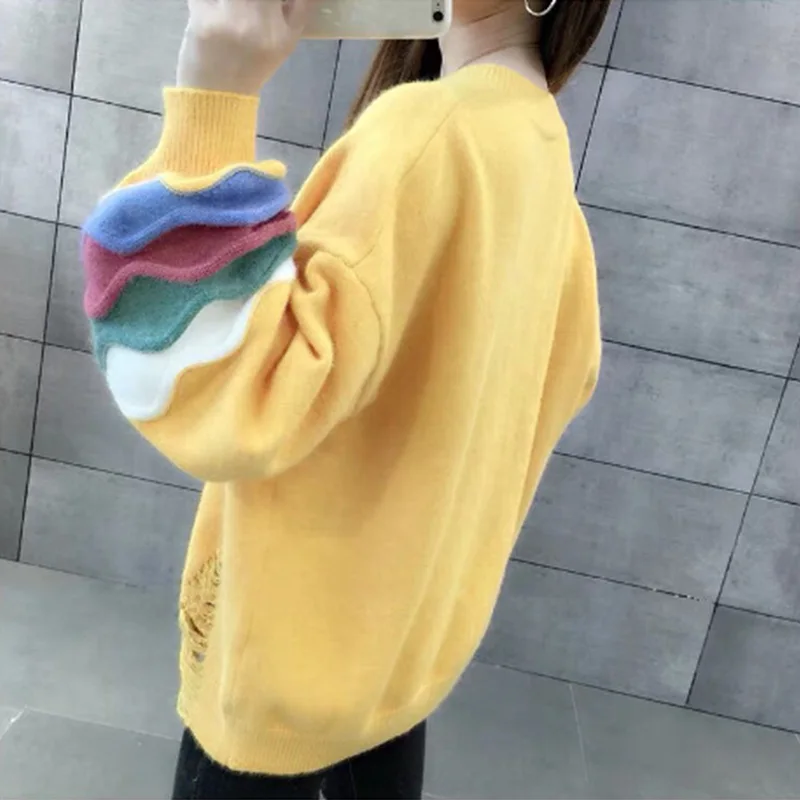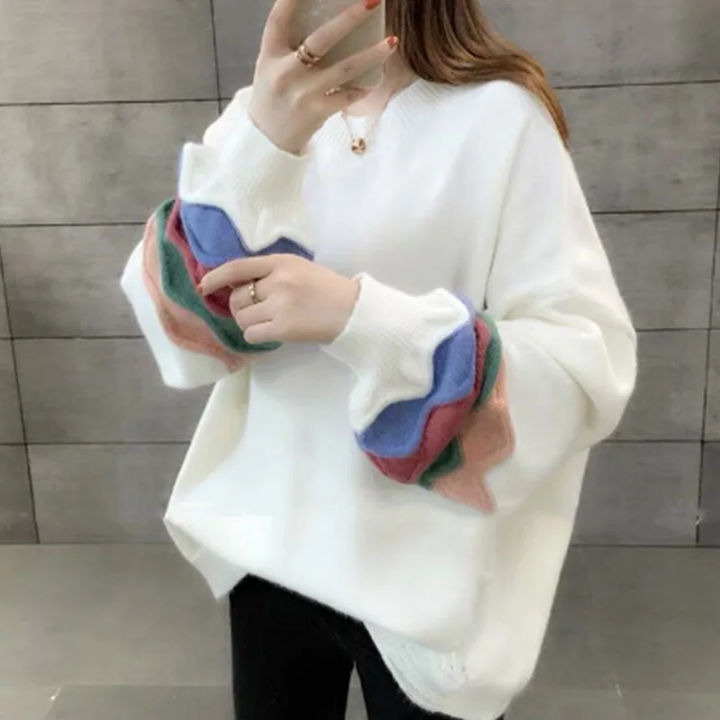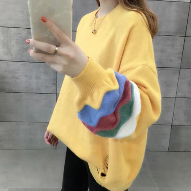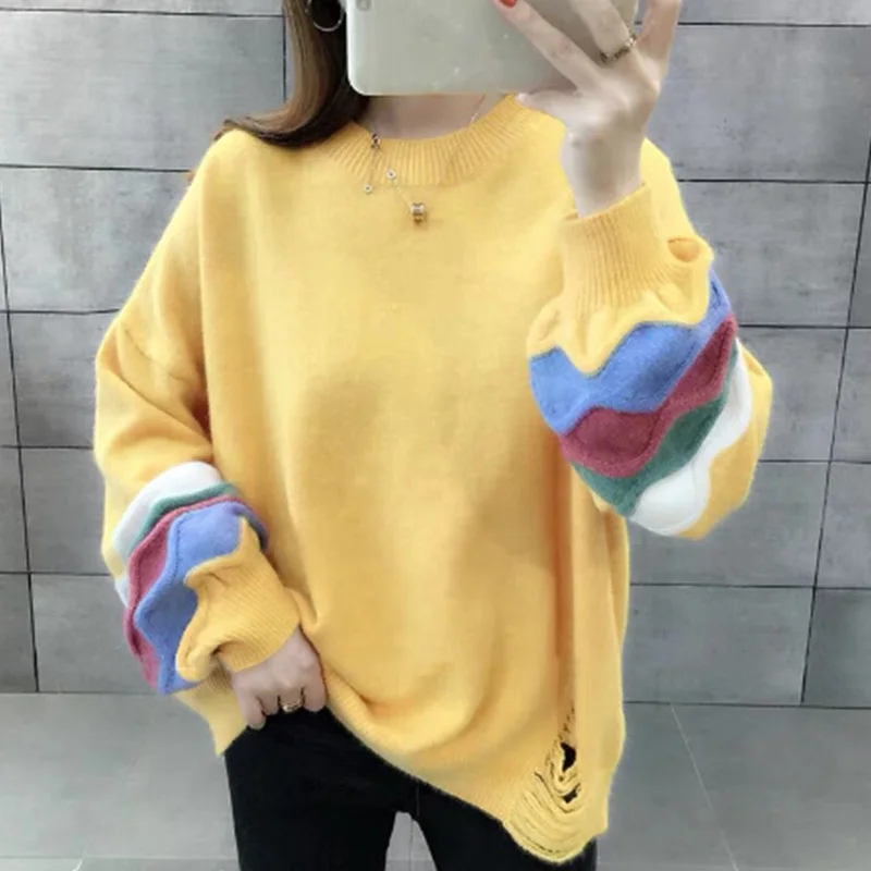 Купить Korean Fashion Solid Color Long Sleeve Color Blocking Striped Printing Loose O-Neck Core Spun Yarn Pullovers Knitted Sweaters за 900рублей
