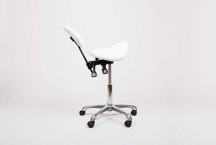 Эргономичный стул для работы с микроскопом. Подлокотники регулируются по высоте и углу наклона. Дополнительно имеют горизонтальную регулировку. Плюсом является удобное сиденье-седло.