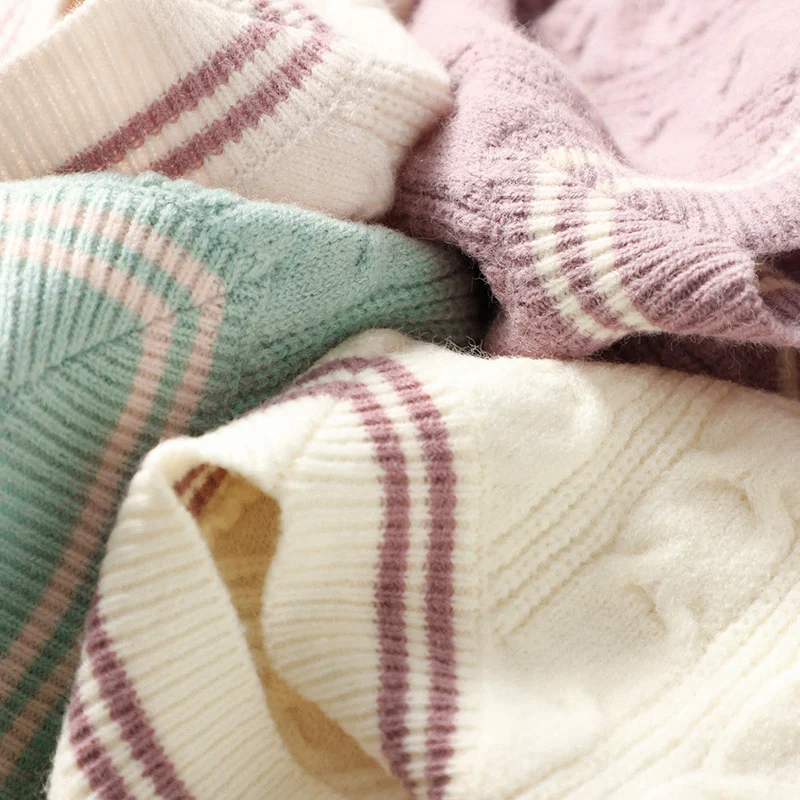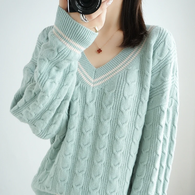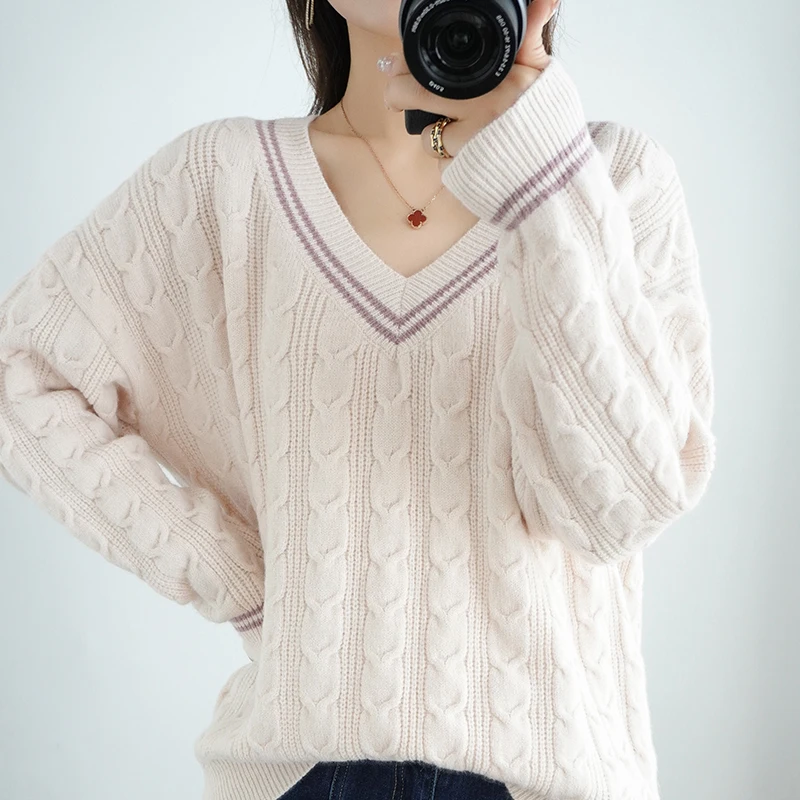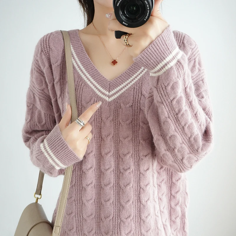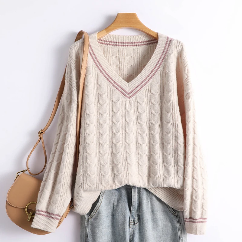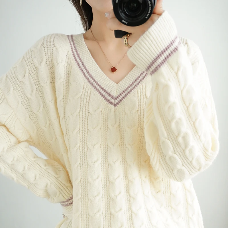 Купить Large V-neck Women's Sweater Pullover Long Sleeve Knitwear Autumn and Winter New Thickened Twisted Loose Western Short Versatile за 1350рублей