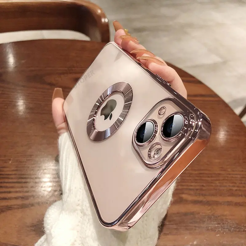 Купить Luxury Square Plating Clear Case For iPhone 14 13 12 11 Pro Max X XR XS 7 8 Plus Charm LOGO Hole Soft Silicone Glass Lens Cover за 200рублей