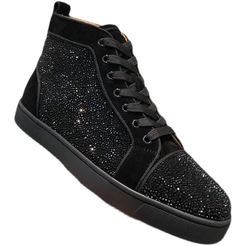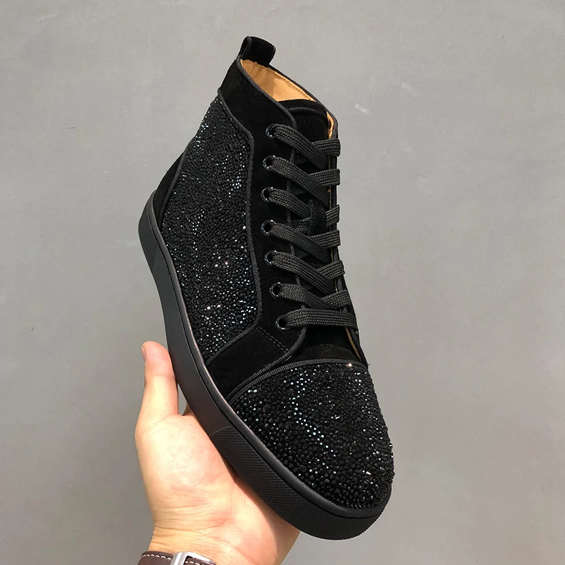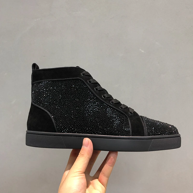 Купить Luxury accessories shoes high top full diamond men's shoes black suede rhinestone red bottom shoes couple models rivet high-top за 500рублей