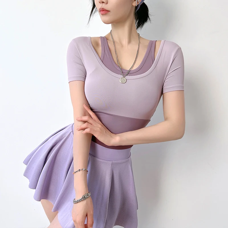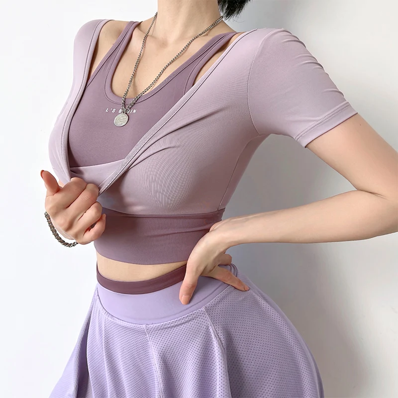 Купить MITAOGIRL Contrast Color Stitching Fake Two-piece T-shirt with Chest Pad Gym Workout Sports T-shirts for Women Tops Summer за 650рублей