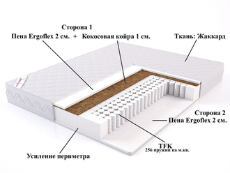 Двустороняя пружинная модель на автономном блоке TFK. Слои бикокоса … ещёи искусственной пены с рельефной поверхностью для легкого массажа спины.