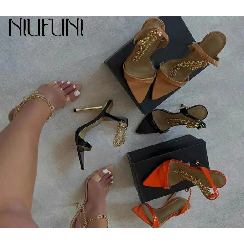 Купить Metal Chain Lock Pointed Toe Electroplated Stiletto High Heels Women's Sandals Sexy Gladiator Summer PVC Sandals Open Toe Shoes за 1600рублей