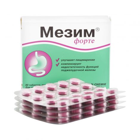 Купить − + Мезим форте, таблетки, 80 шт . . . . В качестве активно действующего вещества в состав Мезим Форте входит панкреатин (порошок из свиной ПЖЖ) в концентрации 93,33 — 107,69 мг/таб . Минимальная . . .