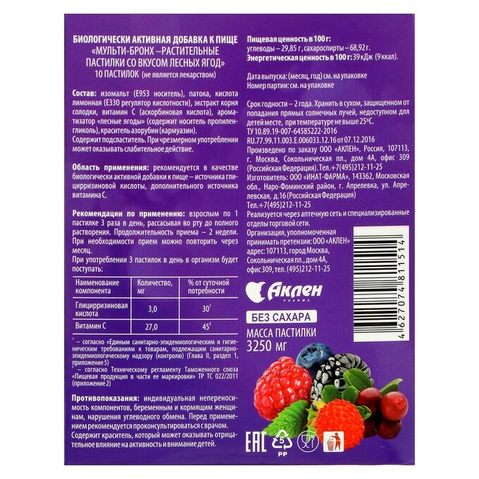 Аклен Мульти-Бронх раст .пастилки без сахара Лесные ягоды №10 по доступной цене в интернет-аптеке Самсон-Фарма, инструкция по применению💊, отзывы и аналоги . Вы можете купить Аклен Мульти-Бронх раст .пастилки без . . .