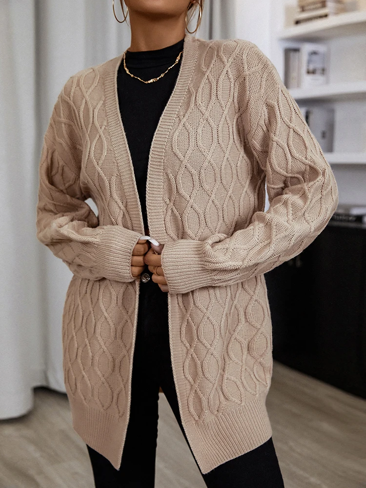 Купить NOOSGOP Solid Khaki Light Brown H Shape Knee Length Loose Open Cardigan Sweater Long Sleeves Winter Cable Pattern Knit Clothing за 2450рублей