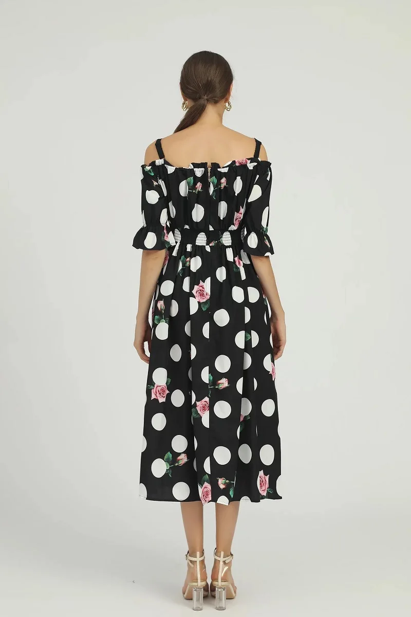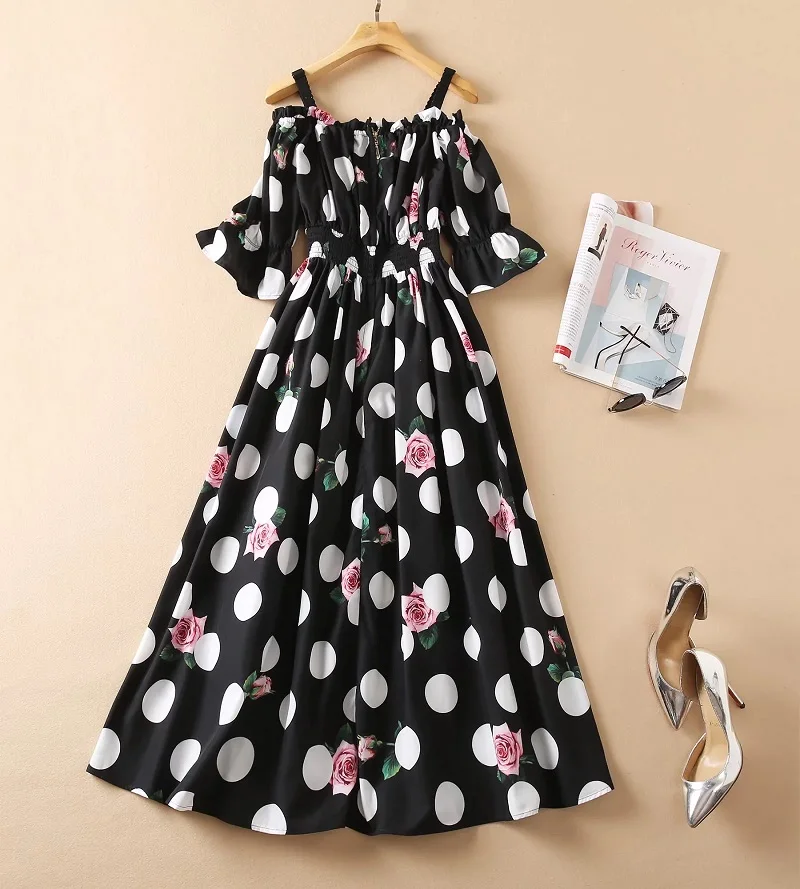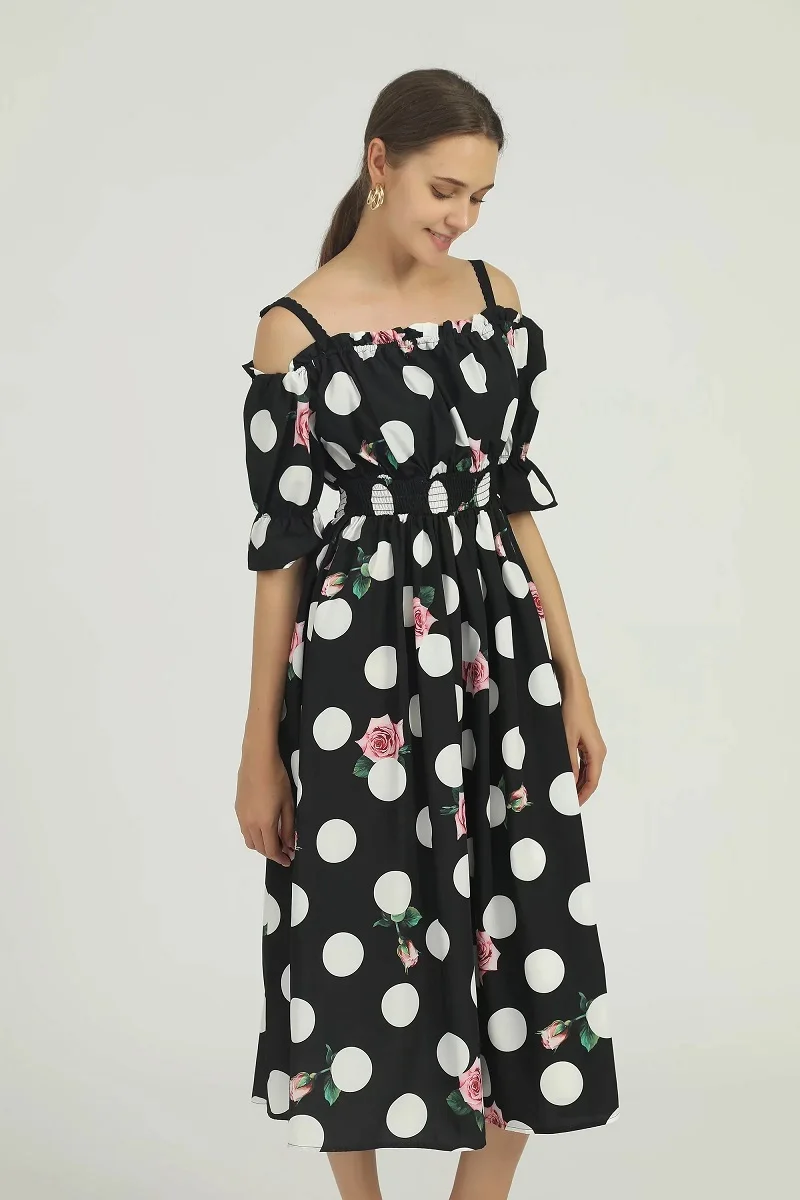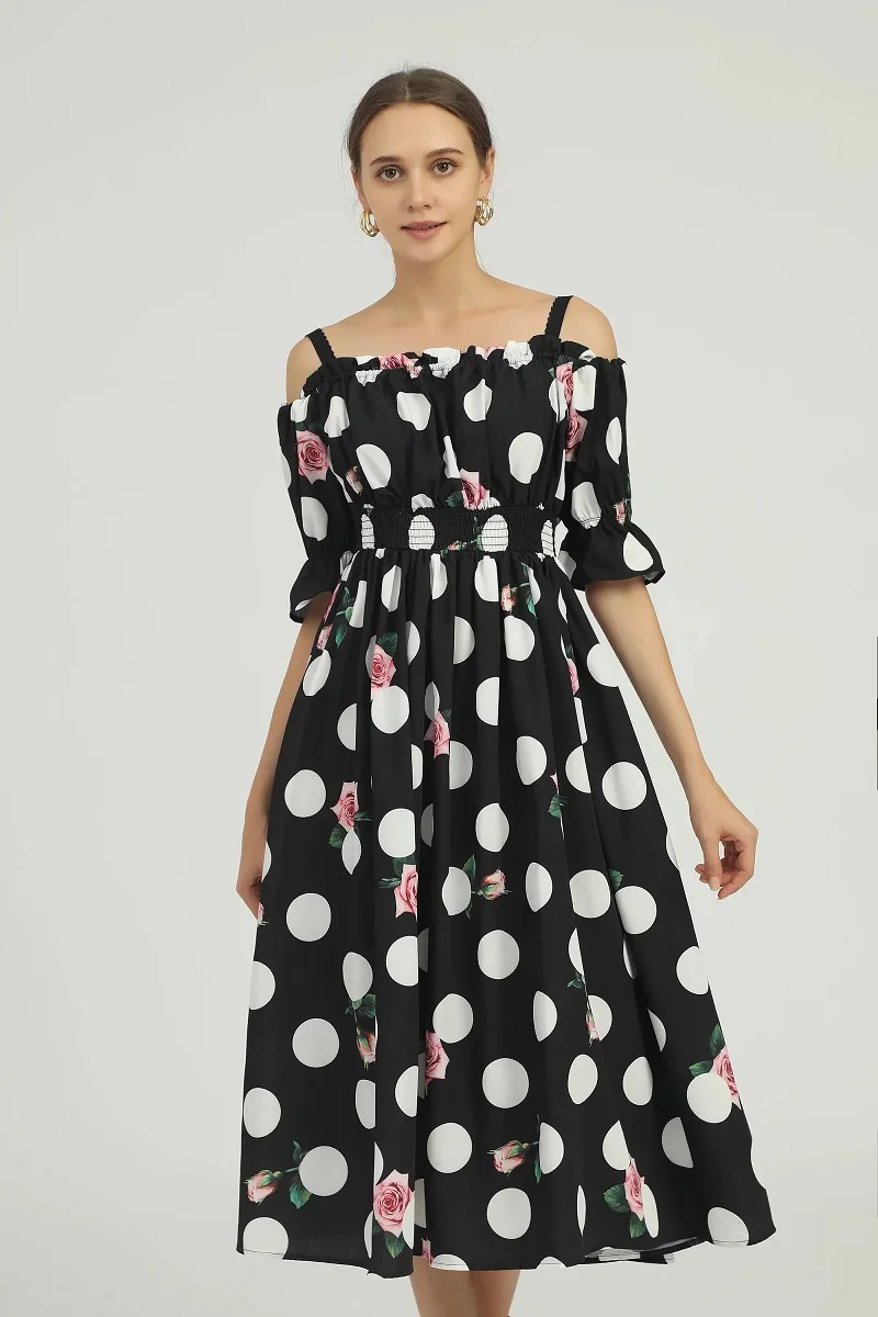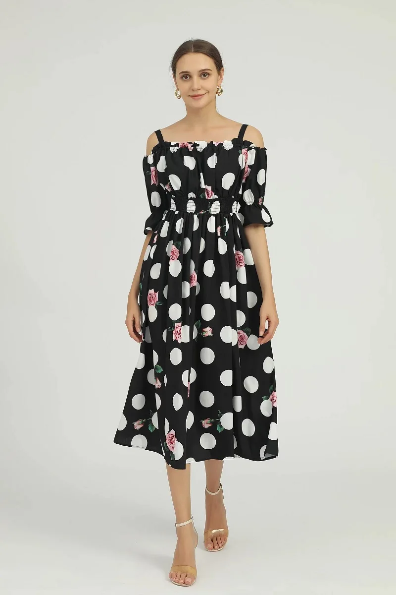Купить New 2022 Spring Summer Dress High Quality Women Spaghetti Strap Polka Dot Print Half Sleeve Mid-Calf Length Casual Boho Dress за 2900рублей