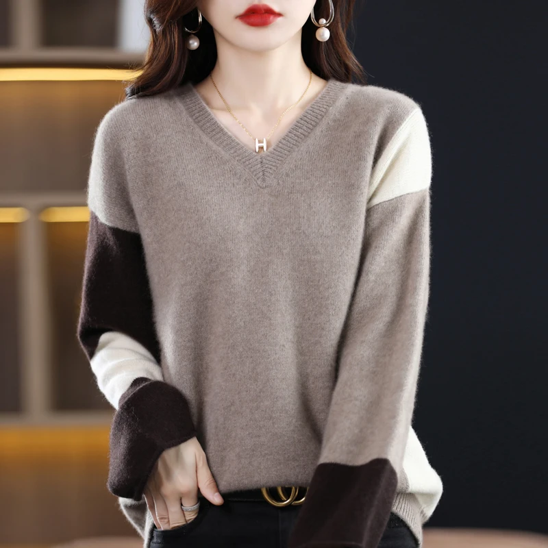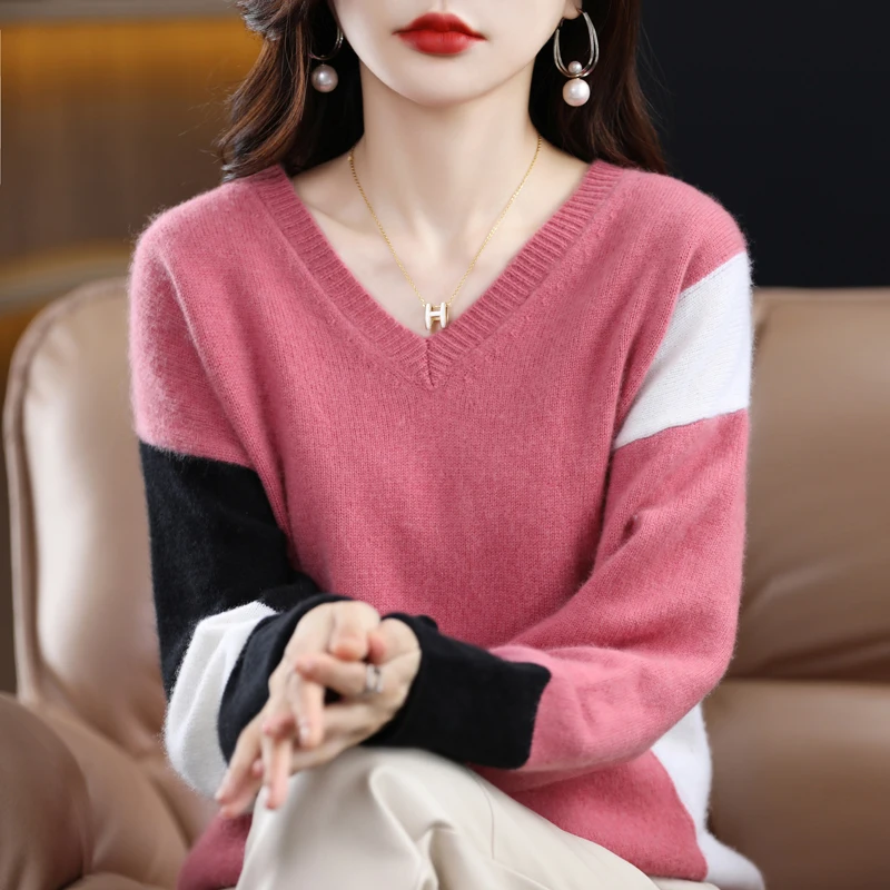 Купить New Autumn And Winter V-neck Cashmere Sweater Color Matching Loose Pullover Slim Wool Sweater Contrast Sleeve Bottoming Shirt за 2250рублей