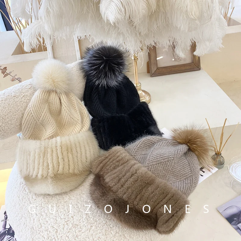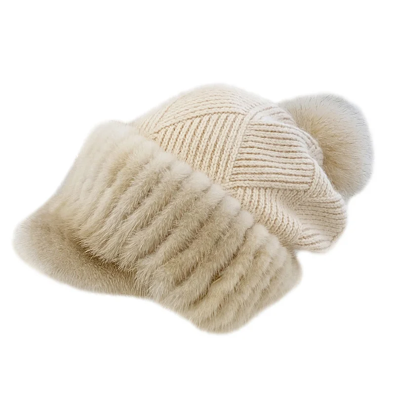 Купить New Mink Fur And Rabbit Fur Blended Knitted Hat Female Fox Fur Ball Ear Protection Winter Korean Version Plus Velet Warm Fur Hat за 3500рублей