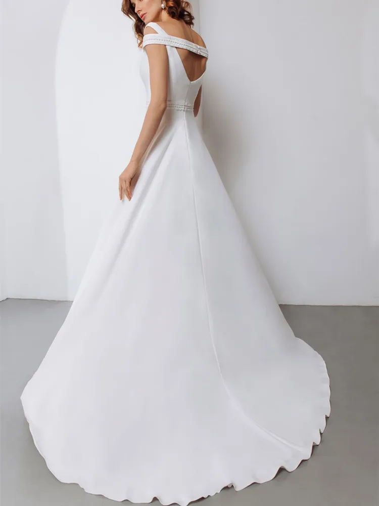Купить Off Shoulder V-Neck Wedding Dress 2021 Appliques Pearls Backless Sweep Train Simple For Women New Arrival Stain A-Line за 4400рублей