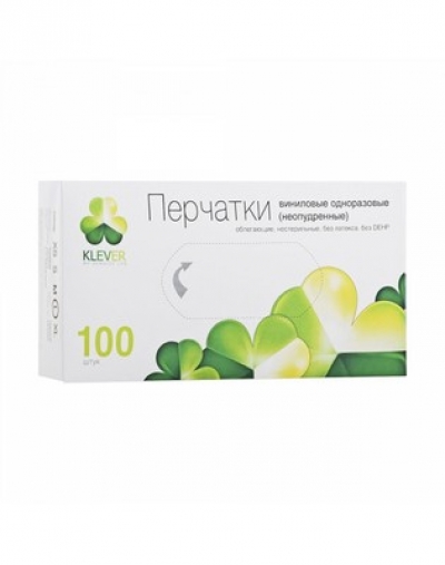 Перчатки "Klever" одноразовые, виниловые, неопудренные, облегающие. Не содержат латекса и DEHP. Перчатки нестерильные. В упаковке: 100 штук