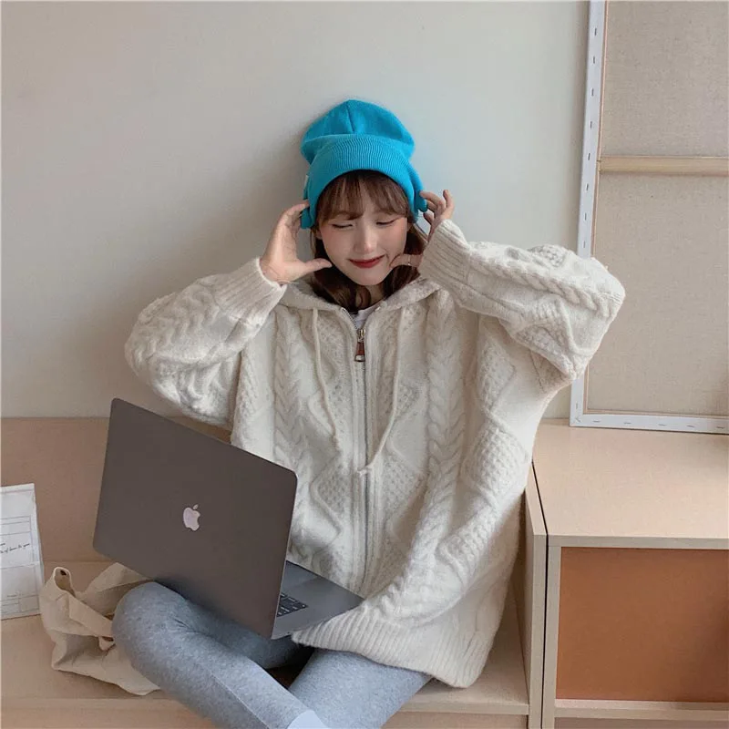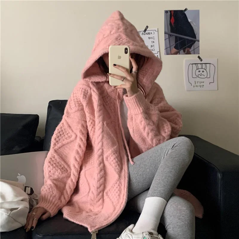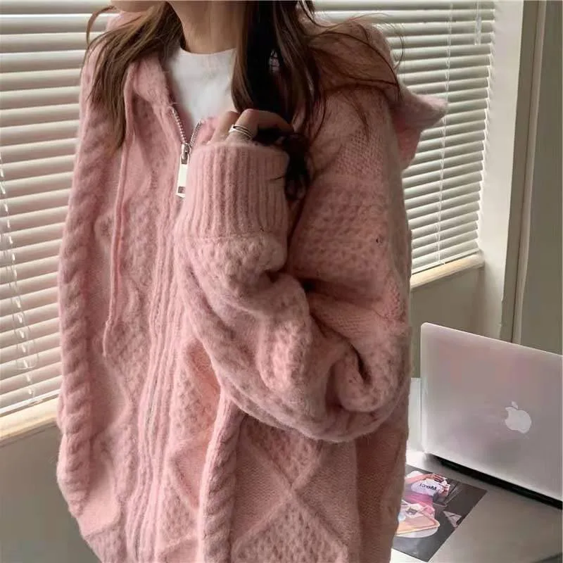 Купить Pink Cute Girl Winter Autumn Women Loose Knitting Jacket Oversized Sweater Cardigan Feminino Y2k Sweaters Crochet Top Hooded за 900рублей