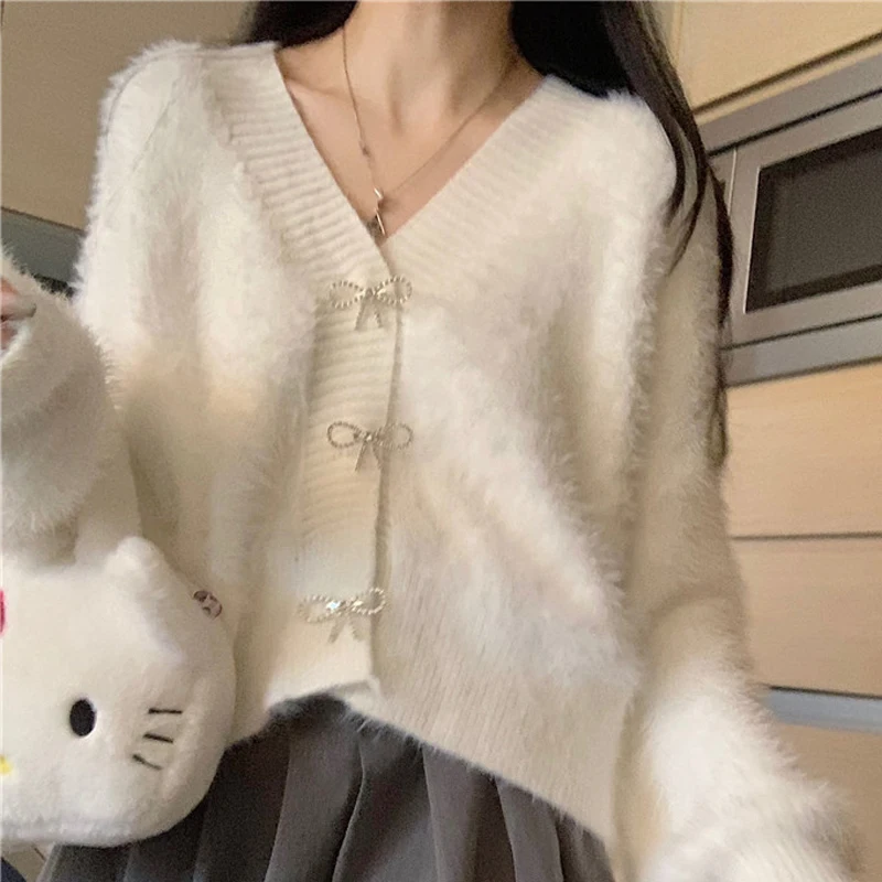 Купить Pink Mink Velvet Sweater Jacket Women Spring Autumn New Korean Version Of Loose V-Neck Niche Design Sense Short Paragraph Top за 1550рублей