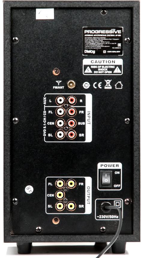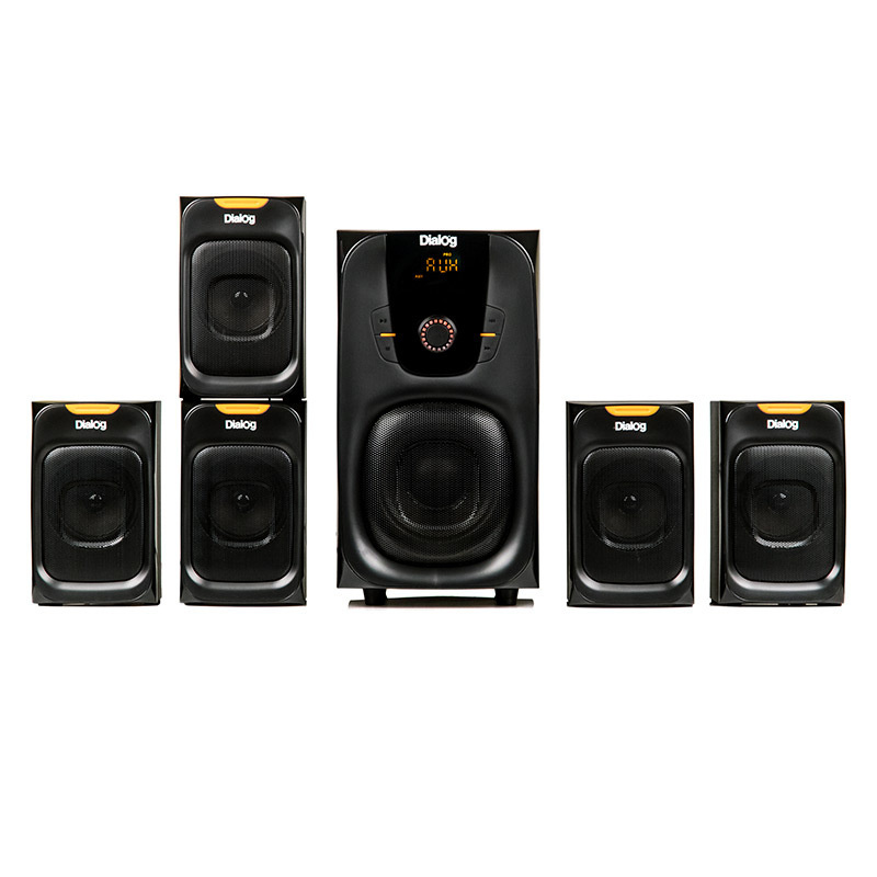 Активная акустическая система формата 5 .1 для домашнего кинотеатра Dialog Progressive AP -555 с Bluetooth, FM радиоприёмником с памятью на 20 радиостанций с корпусом из MDF, слотом USB и кард-ридером SD . Мощность 100 Вт RMS .