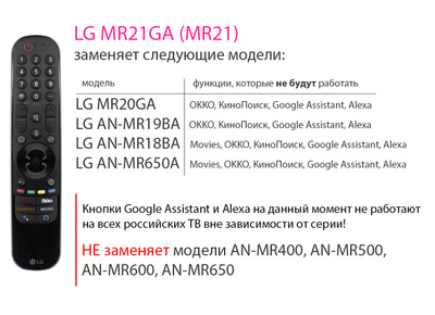 Пульт lg an-mr21gc (mr21n, он же mr21ga, но со встроенным nfc модулем), который выпускается для телевизоров новой линейки 2021 года, но также заменяет некоторые предыдущие magic пульты, а именно модели an-mr650a, an-mr18ba, an-mr19ba, mr20ga .