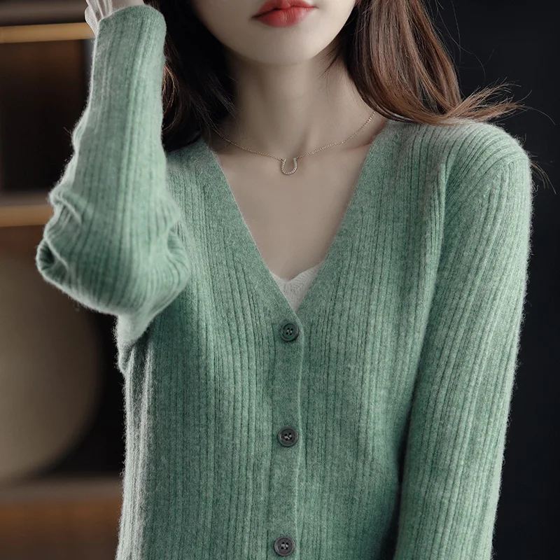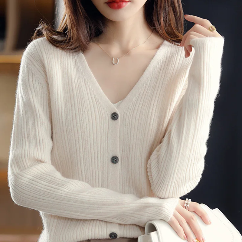 Купить Pure Wool Knitted Cardigan Women's V-Neck Spring And Autumn New Fashion Loose Joker Comfortable Sweater Solid Color Top за 2150рублей