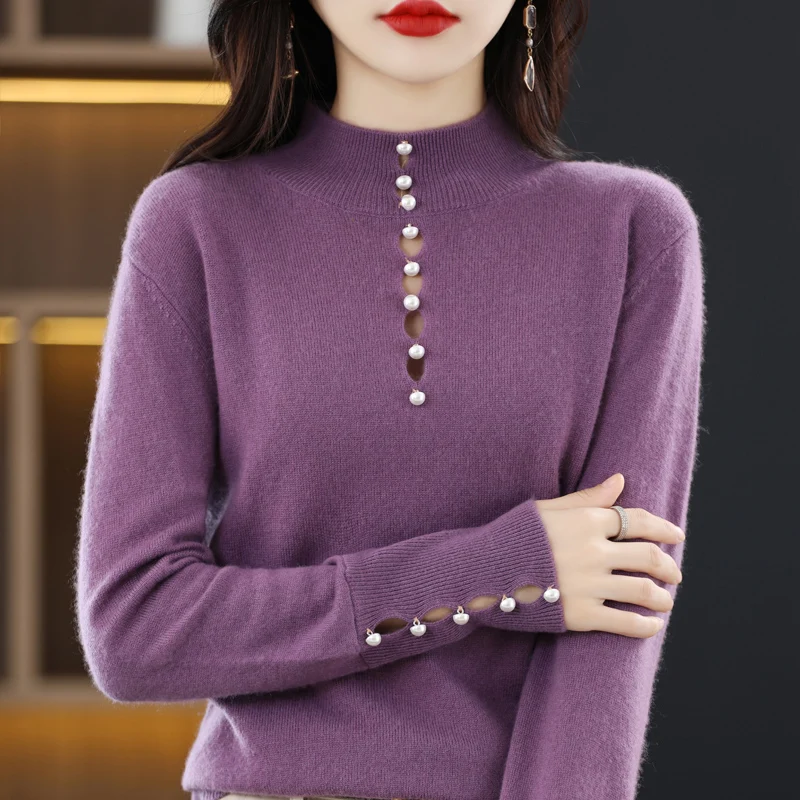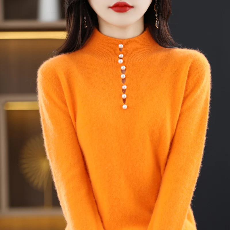 Купить Pure Woolen Sweater Women's New Autumn Winter Pearl Half High Collar Pullover Underlay Loose Versatile Pure Color Cashmere Shirt за 1850рублей